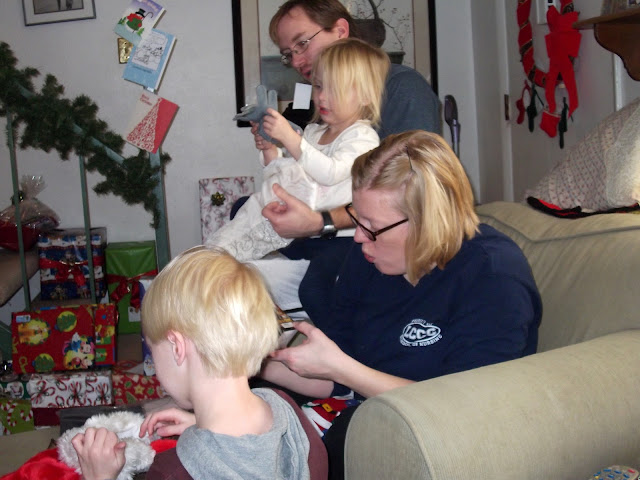 Christmas Eve at my Aunt and Uncle's house. My uncle stoking the fire and everyone watching Landon open his gifts. (He's the only little one in the family at this point)
